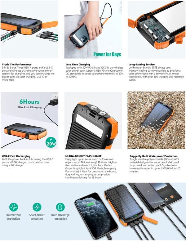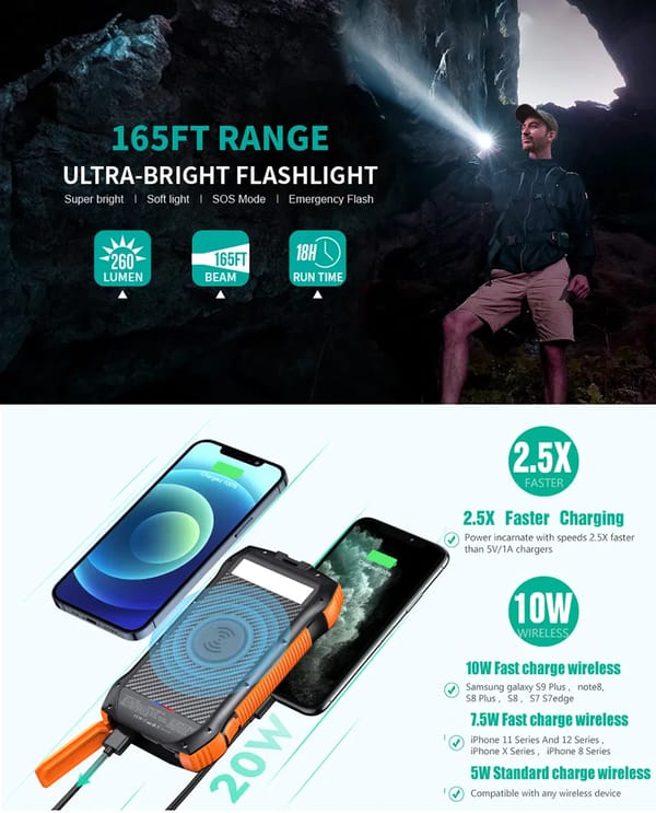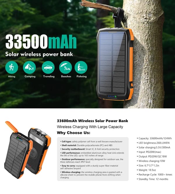 Portable Charger, Solar Power Bank 33500mAh Fast Charging, Solar Battery Pack with Waterproof 6W Bright Flashlight for iPhone Samsung Tablet